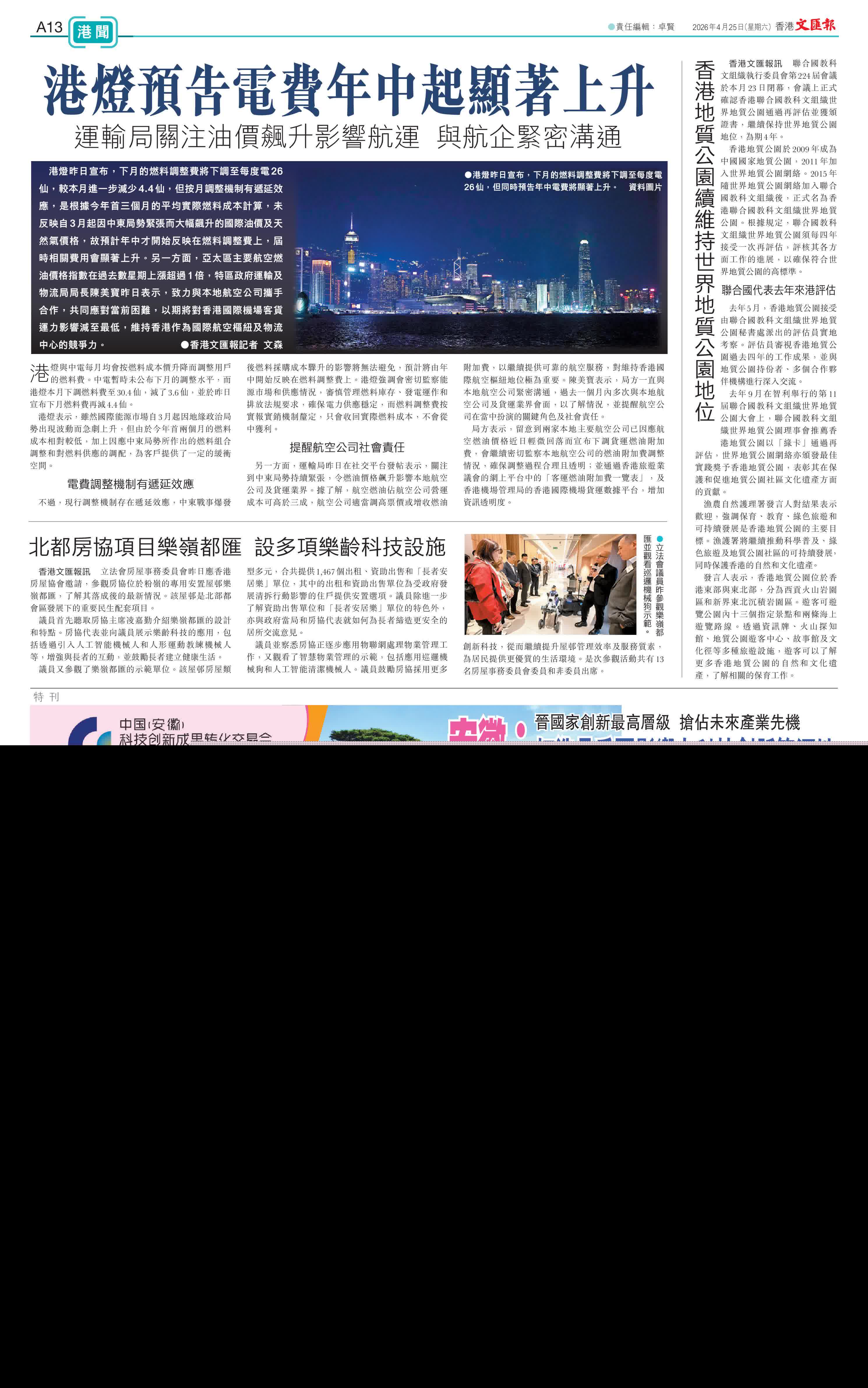 香港文匯報訊(記者 文森)港燈昨日宣布,下月的燃料調整費將下調至每度電26仙,較本月進一步減少4.4仙,但按月調整機制有遞延效應,是根據今年首三個月的平均實際燃料成本計算,未反映自3月起因中東局勢緊張而大幅飆升的國際油價及天然氣價格,故預計年中才開始反映在燃料調整費上,屆時相關費用會顯著上升。另一方面,亞太區主要航空燃油價格指數在過去數星期上漲超過1倍,特區政府運輸及物流局局長陳美寶昨日表示,致力與本地航空公司攜手合作,共同應對當前困難,以期將對香港國際機場客貨運力影響減至最低,維持香港作為國際航空樞紐及物流中心的競爭力。