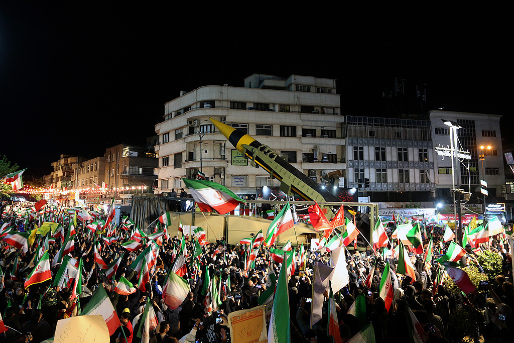 △当地时间4月21日,伊朗德黑兰,民众参加反美反以示威活动,伊朗武装部队在示威区域展示弹道导弹