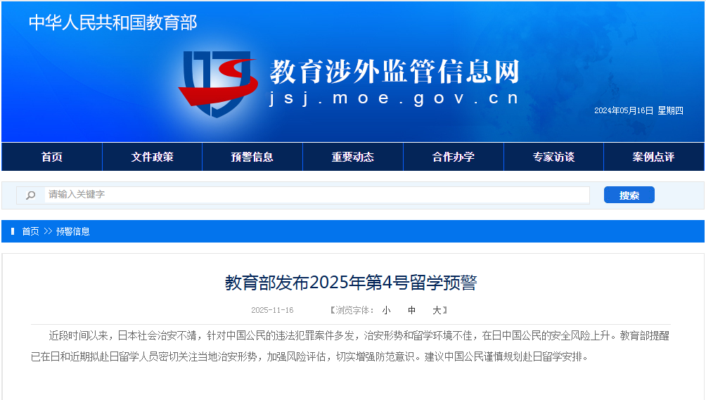 教育部发布2025年第4号留学预警:建议中国公民谨慎规划赴日留学安排