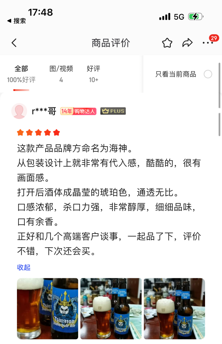 “打开后酒体成晶莹的琥珀色,通透无比。口感浓郁,杀口力强,非常醇厚,细细品味,口有余香。正好和几个高端客户谈事,一起品了下,评价不错,下次还会买。” “不仅口感,包装设计上也非常有代入感,酷酷的,还有大航海时代的神秘感。”“口感醇厚、麦芽浓、品质高、价格:值!!!”在刚刚过去的“双十一”,收到青岛啤酒IPA的消费者纷纷打出五星好评。