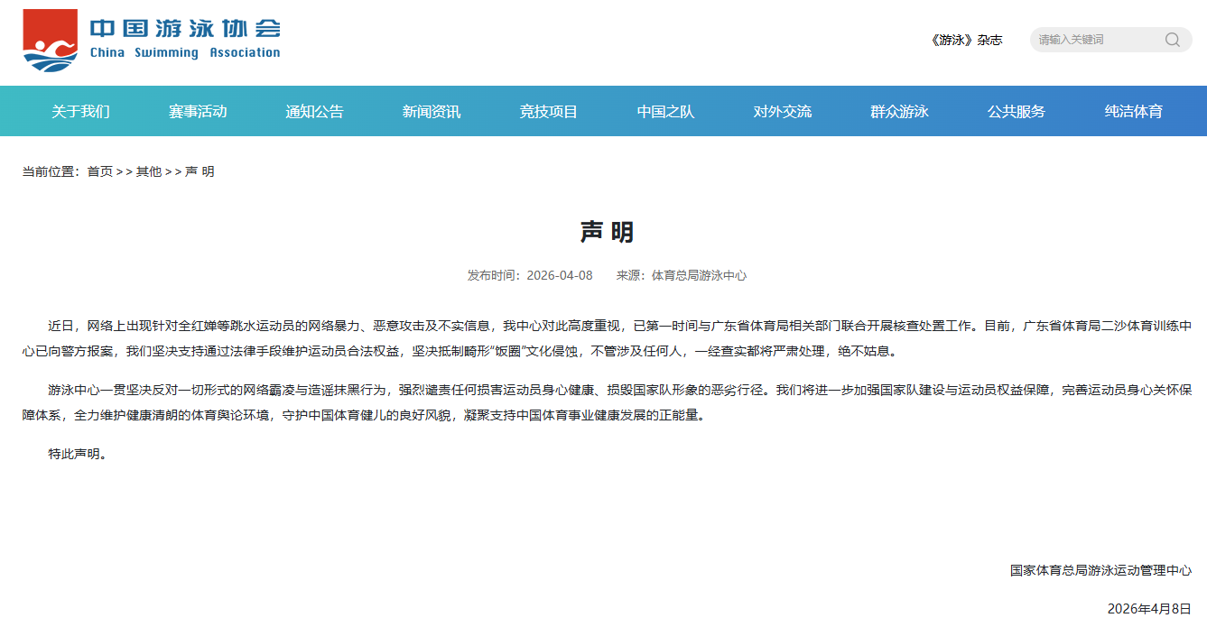 国家体育总局游泳中心就全红婵等跳水运动员遭受网暴一事发布声明