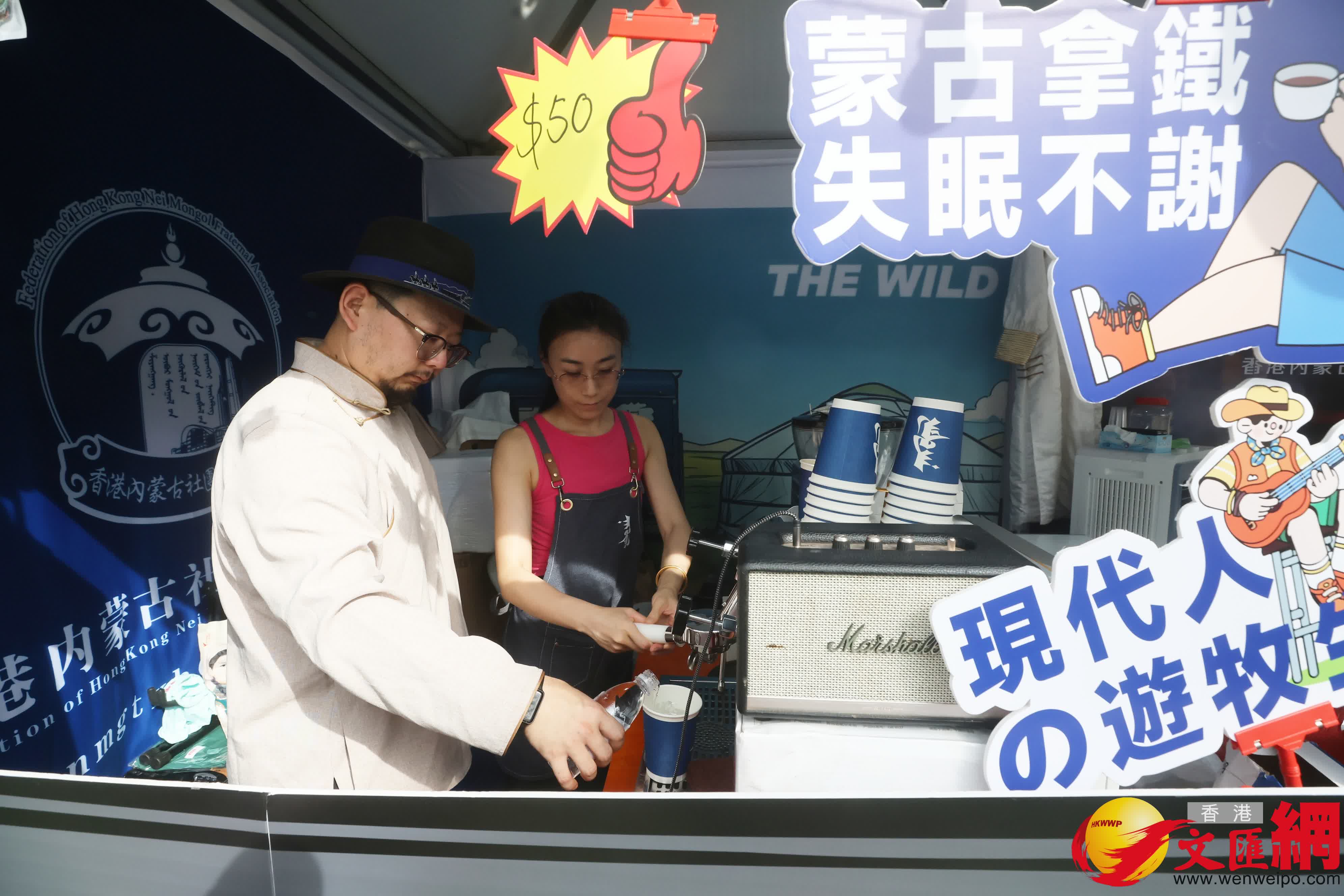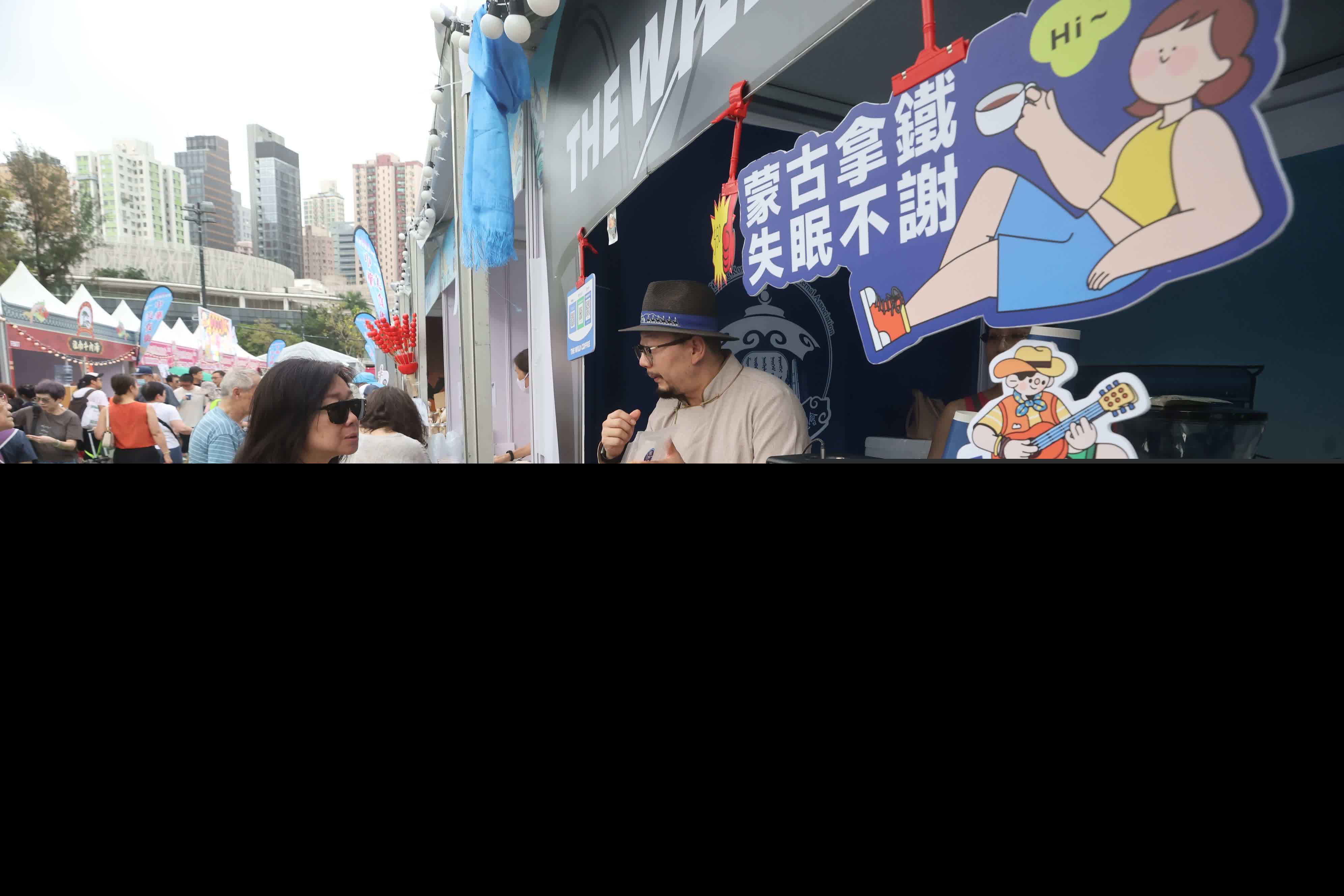 攤位除了美味的熟食外,更特別地設置了一個「遊牧咖啡站」。包豔麗介紹說到,該咖啡站原型就是一輛內蒙草原上的移動咖啡車,而該咖啡車的核心所體現的便是蒙古族在漫長的歷史中,一直是遊牧生活方式的主要實踐者,故取名遊牧咖啡。拿鐵咖啡的製作一般採用的是內蒙的新鮮牛奶,雖然由於遠距離運輸限制,現場使用的是蒙牛牛奶,但咖啡主理人依然力求還原最地道的草原風味。而咖啡杯上還印有一內蒙文化裏象徵着遊牧的含義的圖案,包豔麗指,這次嘉年華特意邀請了咖啡車的主理人參加,是想藉此讓更多人了解內蒙的遊牧文化,進一步推動內蒙文化的傳播。