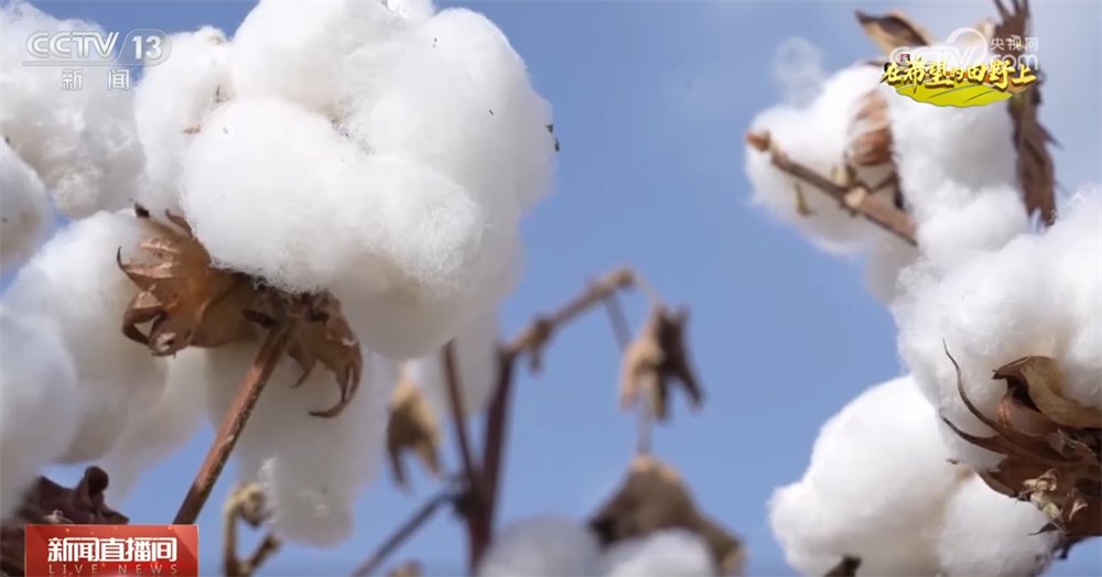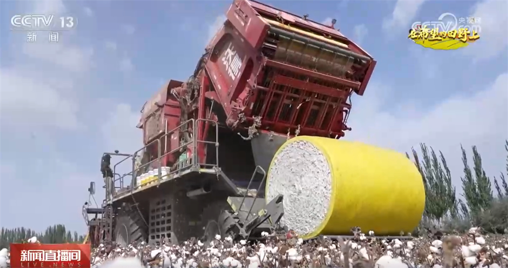 在阿克苏地区库车市牙哈镇棉花种植基地,成片的棉花炸蕾吐絮、花开如雪。一台台大型采棉机穿梭于棉田之间,所到之处,棉花被快速采摘、压缩、打包,形成一个个圆润饱满的棉包,整齐地排列在田间。