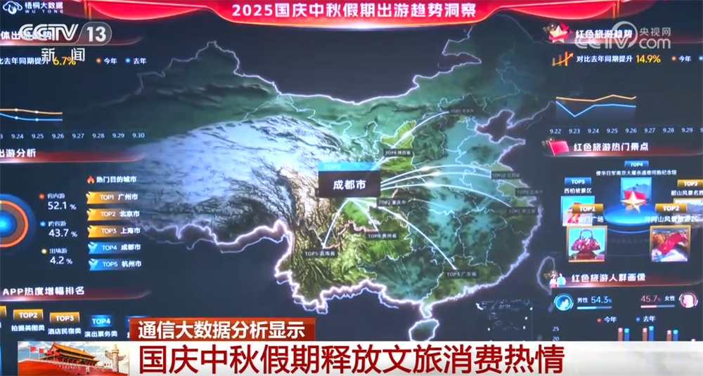央视网消息:国庆中秋假期10月1日开启,移动通信大数据平台分析显示,中秋和国庆连休8天的假期将充分释放全国文旅消费热情。