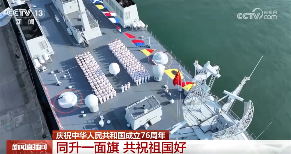 10月1日早上,正在香港访问的海军83舰编队戚继光舰、沂蒙山舰,在香港特别行政区昂船洲军营码头举行庄严的升国旗仪式,庆祝中华人民共和国成立76周年。
