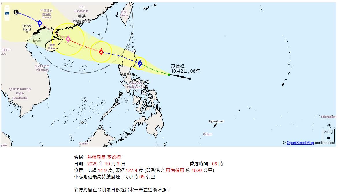熱帶氣旋麥德姆迫近 天文台考慮明晚發一號風球