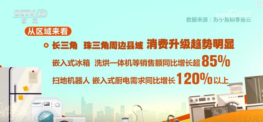 从区域来看,长三角、珠三角周边县域,消费升级趋势明显,嵌入式冰箱、洗烘一体机等销售额同比增长超85%,扫地机器人、嵌入式厨电需求同比增长120%以上;北部及中西部人口大县高端智能产品渗透率逐步提升。
