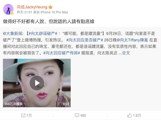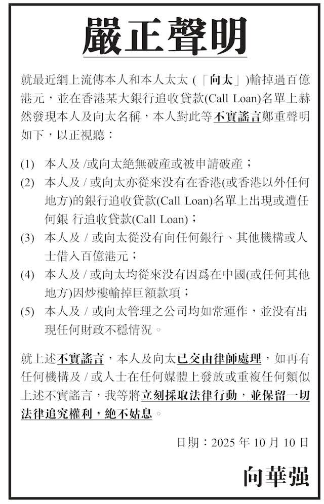 「就最近網上流傳本人和本人太太(「向太」)輸掉過百億港元,並在香港某大銀行追收貸款(Call Loan)名單上赫然發現本人及向太名稱,本人對此等不實謠言鄭重聲明如下,以正視聽:(1)本人及/或向太絕無破產或被申請破產;本人及/或向太亦從來沒有在香港(或香港以外任何地方)的銀行追收貸款(Call Loan)名單上出現或遭任何銀行追收貸款(Call Loan);(3)本人及/或向太從沒有向任何銀行、其他機構或人士借入百億港元;(4)本人及/或向太均從來沒有因為在中國(或任何其他地方)因炒樓輸掉巨額款項;(5)本人及/向太管理之公司均如常運作,並沒有出現任何財政不穩情況。就以上不實謠言,本人及向太已交由律師處理,如再有任何機構及/或人士在任何媒體上發放或重複任何類似以上不實謠言,我等將立刻採取法律行動,並保留一切法律追究權利,絕不姑息。」