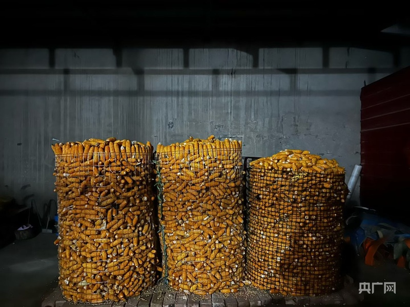 安阳内黄县丁先生用通风透气的铁丝笼存储玉米棒,置于自家带棚庭院内。受访者供图