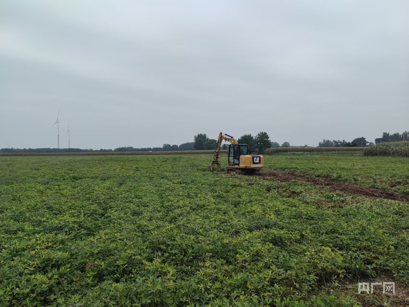 在河南兰考县,为了应对降雨造成的轮式机械无法进地收割,临时将一台履带式挖土机改装成花生收获机,下地作业。受访者供图