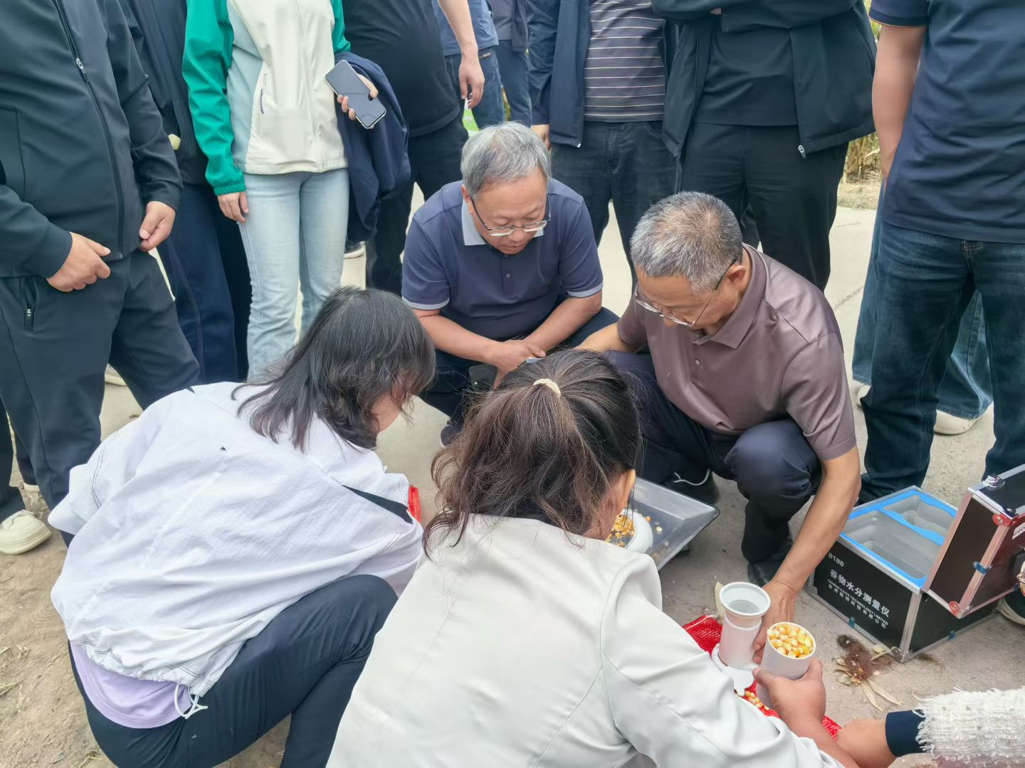 农业科学院专家们正在给制种玉米样本测量水分。周桐 摄