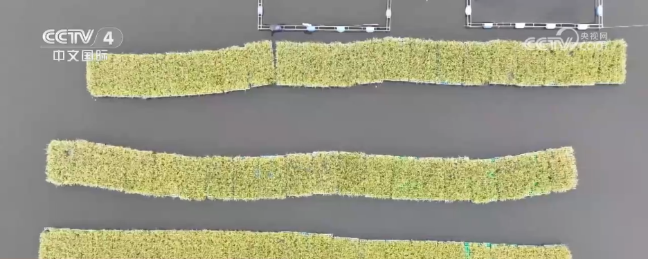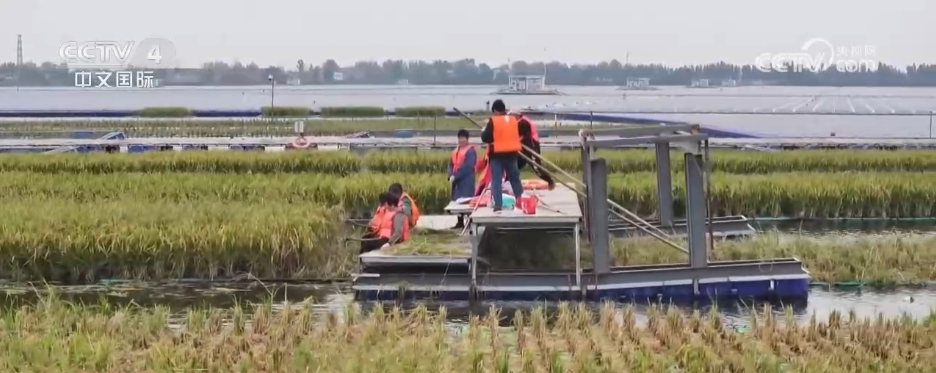 而在安徽淮南,这片由采煤沉陷区改造而来的水上稻田也迎来丰收。一株株水稻被种植在浮床上,技术专家在基质盆内提前放入缓释肥,可以持续补充肥效。专门设计的“浮动收割平台”上,农户排成一排,从漂浮板上提起水稻,用镰刀割下稻穗,这片实验田经测算亩产超过500公斤。水面种植还净化了水体,为鱼类生长提供了良好条件。