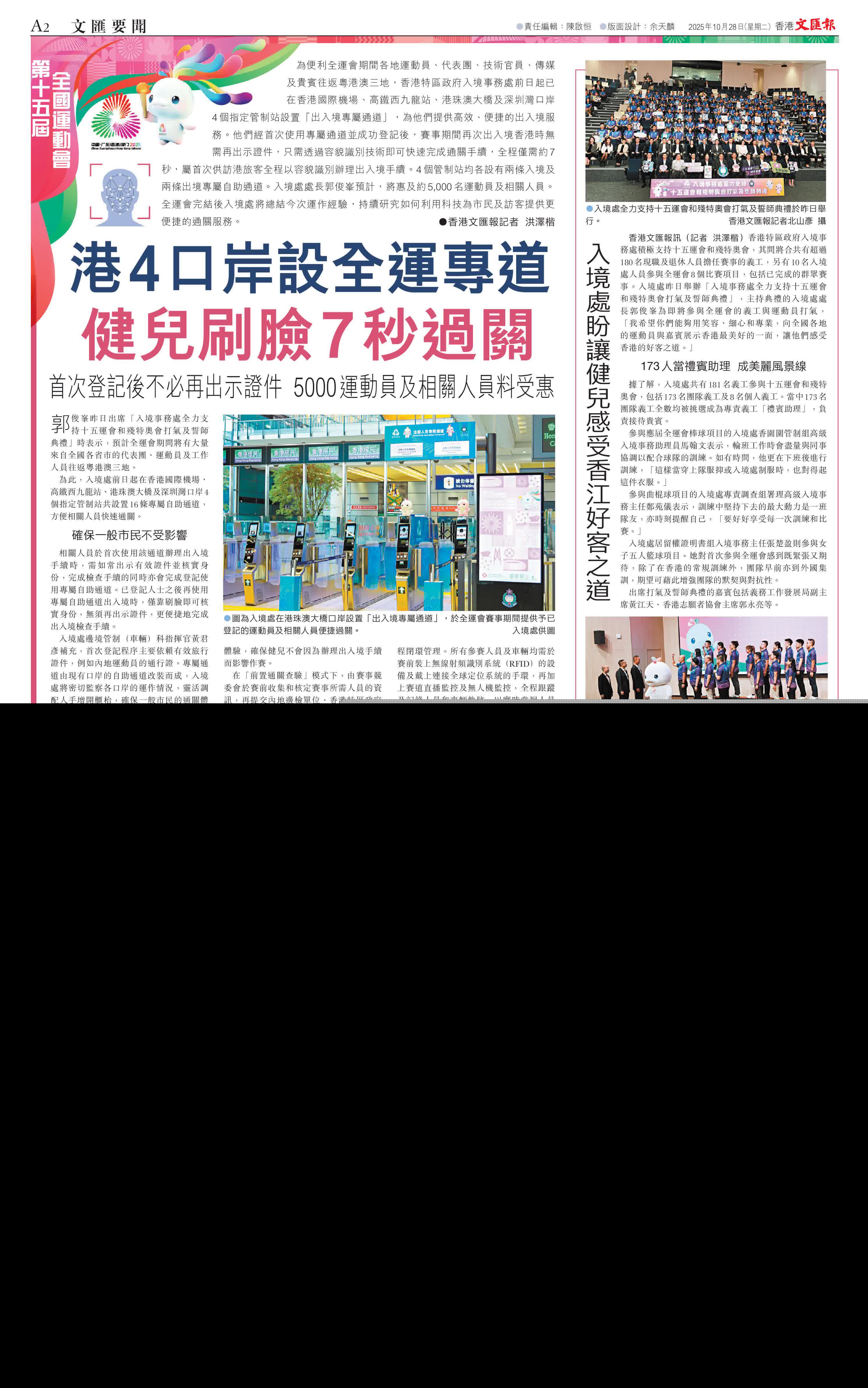 (香港文匯報記者 洪澤楷)為便利全運會期間各地運動員、代表團、技術官員、傳媒及貴賓往返粵港澳三地,香港特區政府入境事務處前日起已在香港國際機場、高鐵西九龍站、港珠澳大橋及深圳灣口岸4個指定管制站設置「出入境專屬通道」,為他們提供高效、便捷的出入境服務。他們經首次使用專屬通道並成功登記後,賽事期間再次出入境香港時無需再出示證件,只需透過容貌識別技術即可快速完成通關手續,全程僅需約7秒,屬首次供訪港旅客全程以容貌識別辦理出入境手續。4個管制站均各設有兩條入境及兩條出境專屬自助通道。入境處處長郭俊峯預計,將惠及約5,000名運動員及相關人員。全運會完結後入境處將總結今次運作經驗,持續研究如何利用科技為市民及訪客提供更便捷的通關服務。