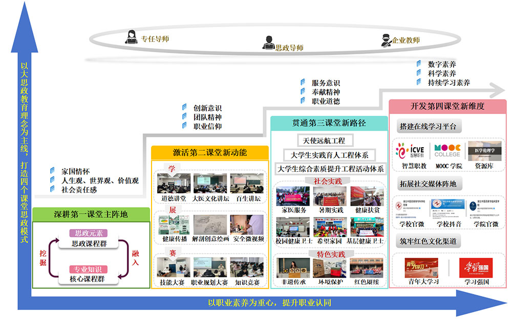 以大思政教育理念为引领,打造“第一课堂理论讲授打基础、第二课堂学展赛育拓视野、第三课堂实践淬炼强担当、第四课堂云端浸润常陪伴”的立体化思政模式,多维赋能村医学生职业认同培育与价值引领效能。