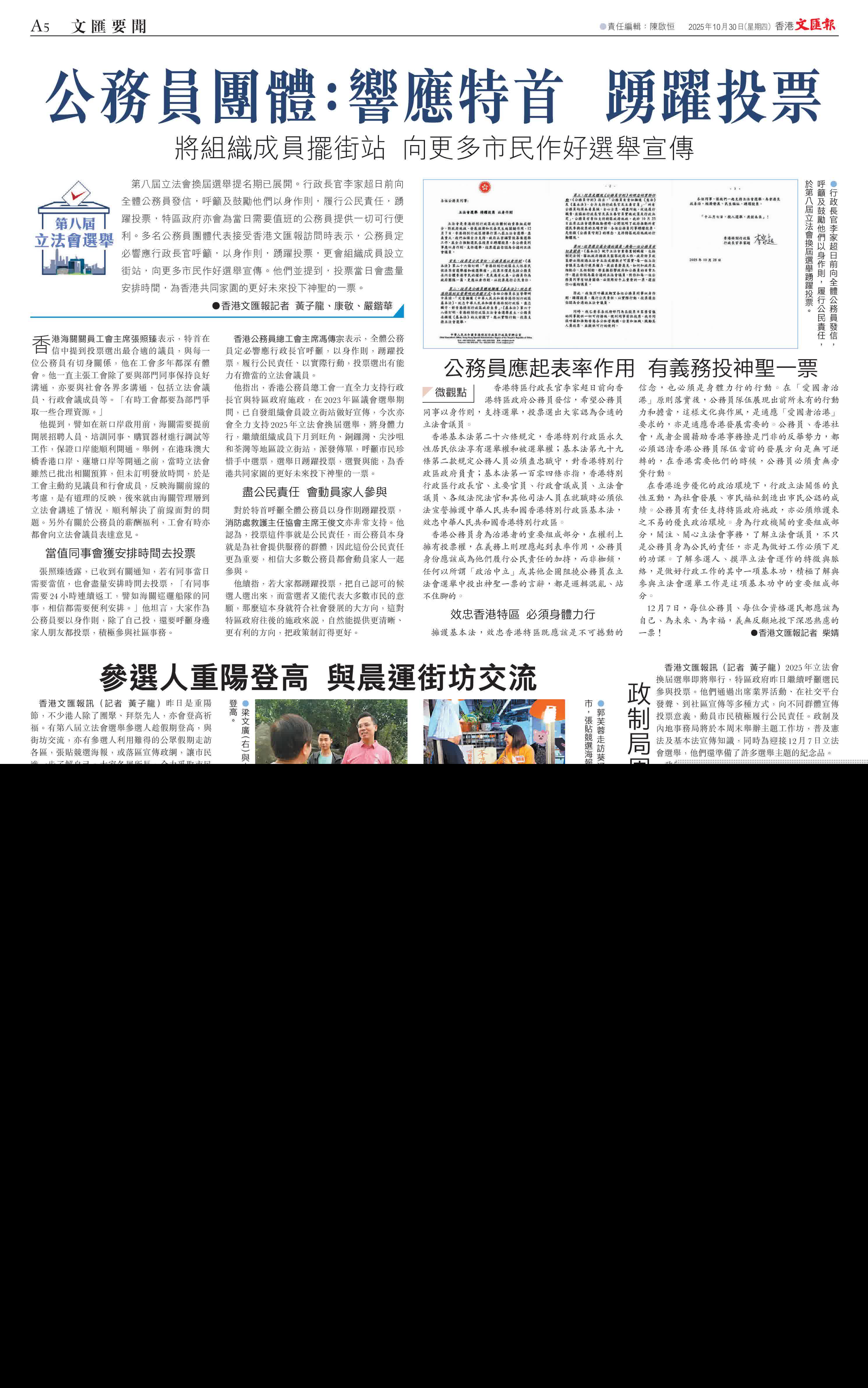 他指出,香港公務員總工會一直全力支持行政長官與特區政府施政,在2023年區議會選舉期間,已自發組織會員設立街站做好宣傳,今次亦會全力支持2025年立法會換屆選舉,將身體力行,繼續組織成員下月到旺角、銅鑼灣、尖沙咀和荃灣等地區設立街站,派發傳單,呼籲市民珍惜手中選票,選舉日踴躍投票,選賢與能,為香港共同家園的更好未來投下神聖的一票。