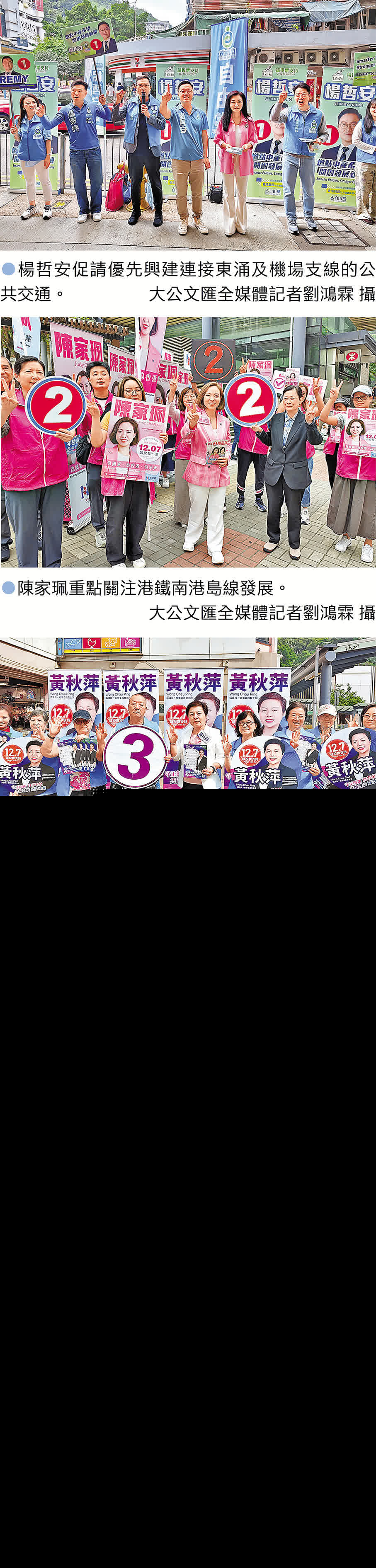 (記者 嚴鍇華、大公文匯全媒體記者 劉鴻霖)香港島西選區5位參選人包括楊哲安、陳家珮、黃秋萍、陳學鋒、郭偉强昨日趁周日,四出開展選舉攻勢。大公文匯全媒體記者及香港文匯報記者分別於上午11時在港鐵堅尼地城站C出口,及下午於港鐵東涌站採訪拉票活動。只見站外街道旗海飄揚,各參選人與義工團隊擺好陣勢,不斷嗌咪闡述自己的政綱力爭市民支持,其間更把握機會接觸市民,選舉氣氛頗為熾熱。