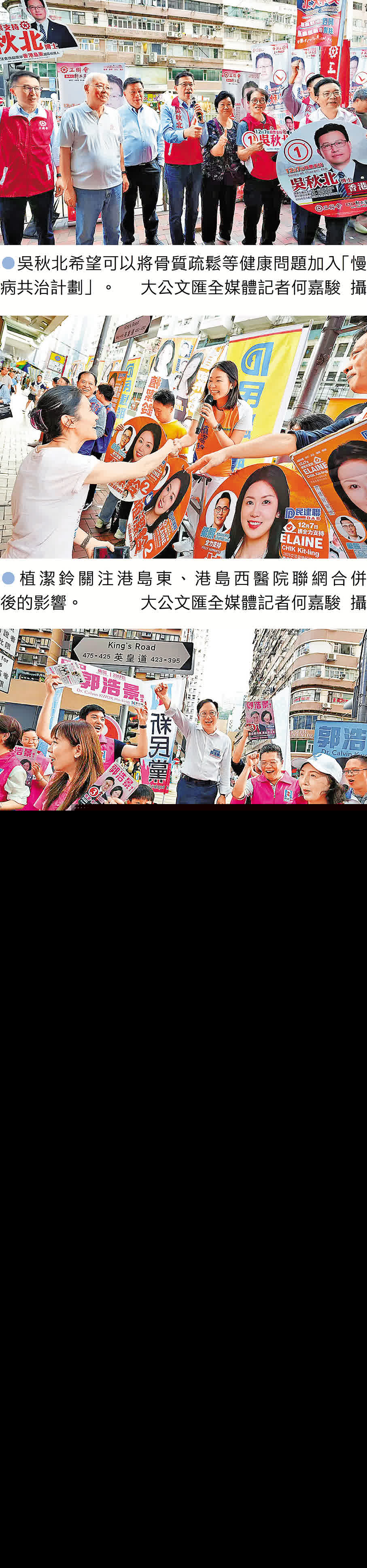 (大公文匯全媒體記者 義昊、周傾芫)昨日下午,港島東選區5名參選人在港鐵北角站外設立街站,向市民介紹政綱。他們都不約而同提到基層醫療與人口老齡化的議題,有參選人呼籲擴大「慢病共治計劃」範圍及醫管局藥物名冊名單,亦有參選人呼籲將自願醫保計劃的保障範圍擴大至中醫醫院服務,推動全面公營牙科服務計劃等,並呼籲政府推出不同措施,更好照顧長者需要。