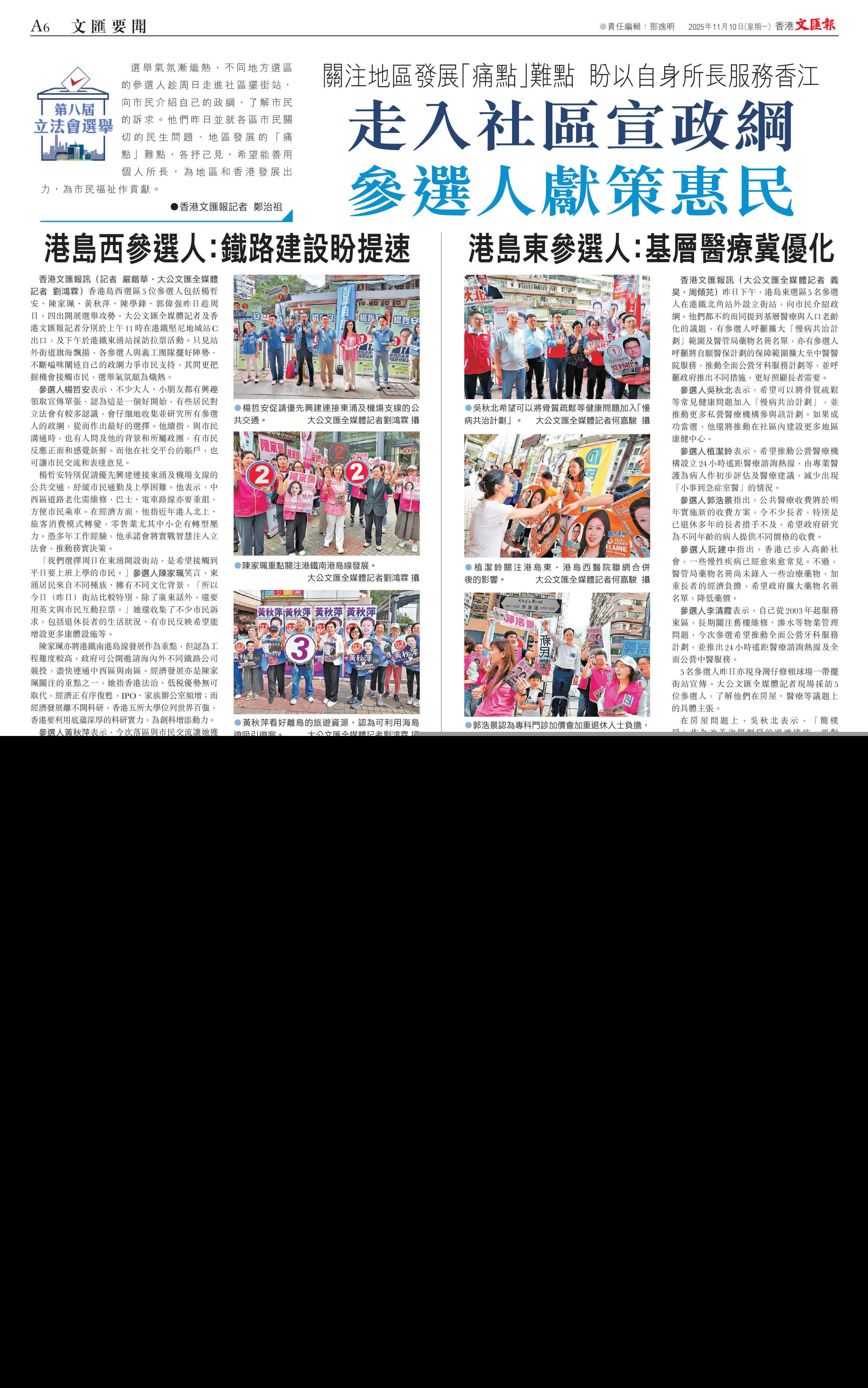 今屆立法會選舉區區有競爭,從各位參選人的社交平台內容可見,各選區的參選人紛紛亮招,選戰已然開展,他們利用周末時間積極落區與市民交流,有的在港鐵站附近擺街站,有的走訪不同屋邨,並在言談中發現社區問題,積極着手推動改進,他們亦積極爭取名人支持,希望取得更多選票,進入議會服務市民。