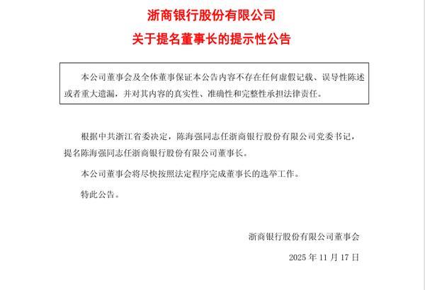 中国网财经11月18日讯 11月17日,浙商银行发布公告显示,根据中共浙江省委决定,陈海强任浙商银行党委书记,提名陈海强任浙商银行董事长。浙商银行董事会将尽快按照法定程序完成董事长的选举工作。