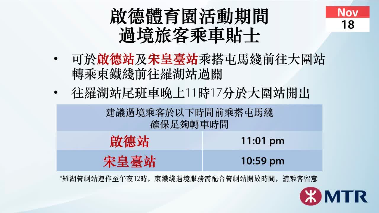 另外,港鐵提醒過境旅客留意東鐵綫尾班車時間,提早計劃行程及預留足夠轉車時間。