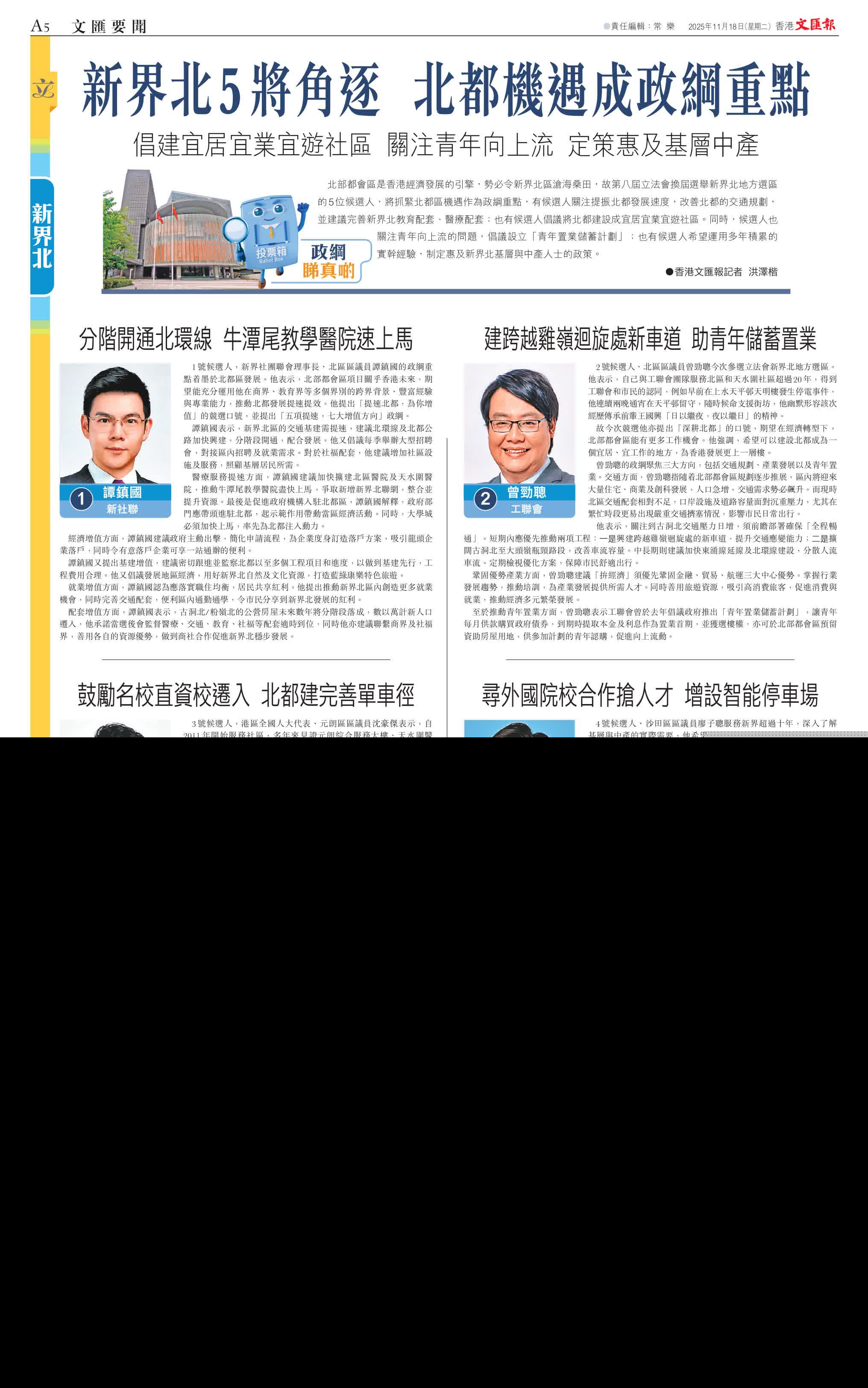 故今次競選他亦提出「深耕北都」的口號,期望在經濟轉型下,北部都會區能有更多工作機會。他強調,希望可以建設北都成為一個宜居、宜工作的地方,為香港發展更上一層樓。