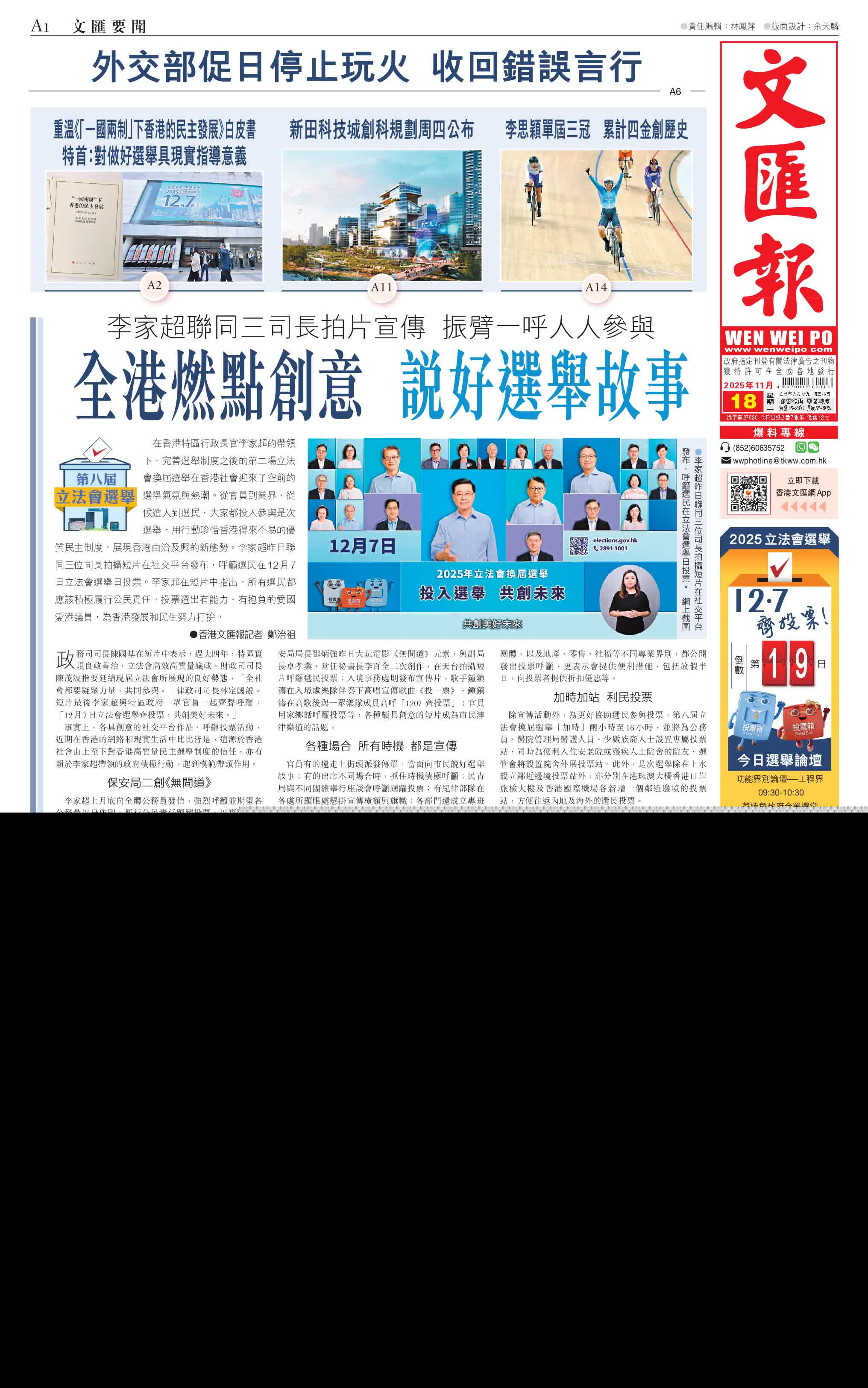 香港文匯報訊(記者 鄭治祖)在香港特區行政長官李家超的帶領下,完善選舉制度之後的第二場立法會換屆選舉在香港社會迎來了空前的選舉氣氛與熱潮。從官員到業界、從候選人到選民,大家都投入參與是次選舉,用行動珍惜香港得來不易的優質民主制度,展現香港由治及興的新態勢。李家超昨日聯同三位司長拍攝短片在社交平台發布,呼籲選民在12月7日立法會選舉日投票。李家超在短片中指出,所有選民都應該積極履行公民責任,投票選出有能力、有抱負的愛國愛港議員,為香港發展和民生努力打拚。