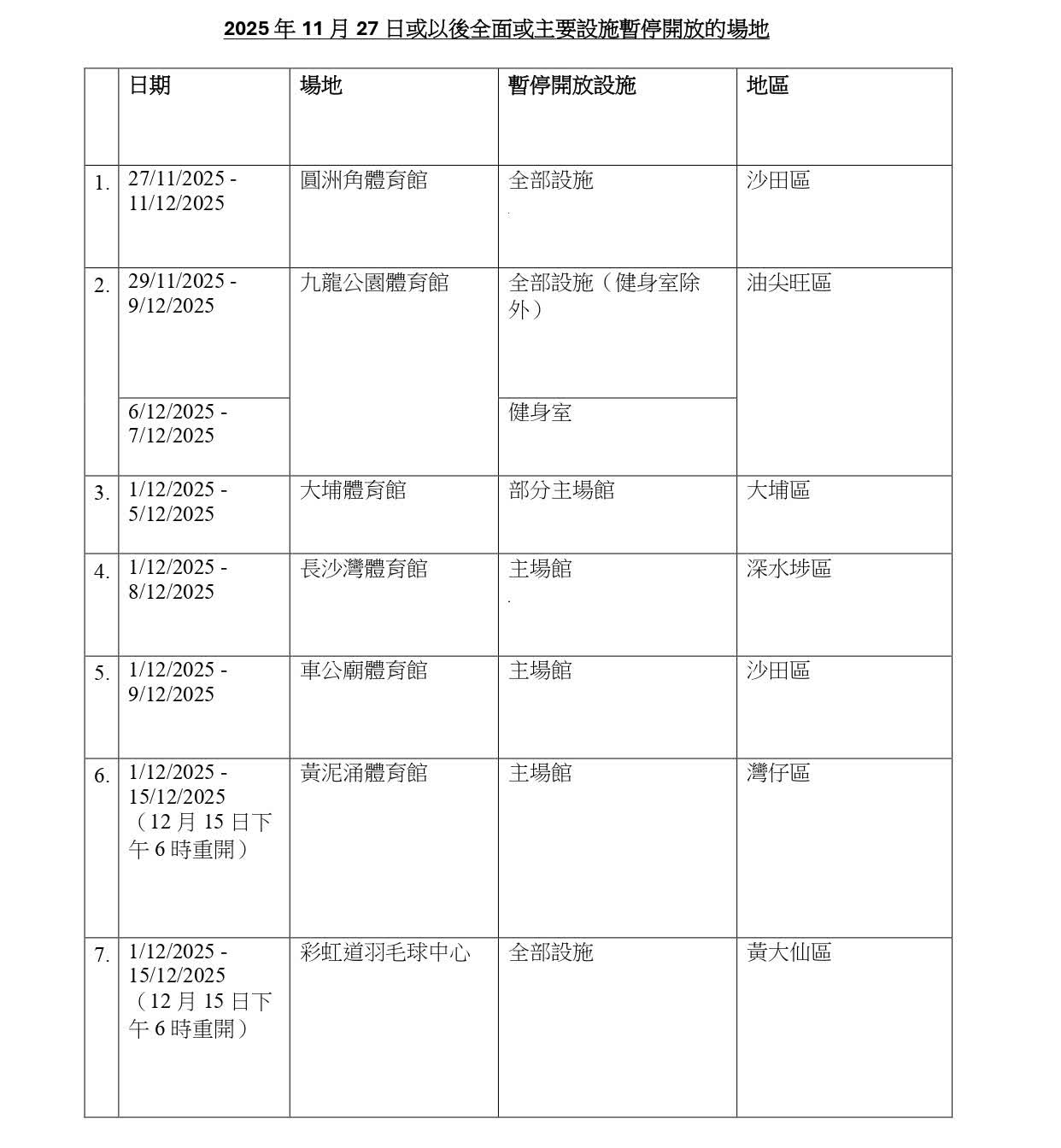 康文署指,有關設施暫停開放期間,市民可使用區內其他同類康樂設施。暫停開放日期如因應實際情況需予以調整,會另作公布。