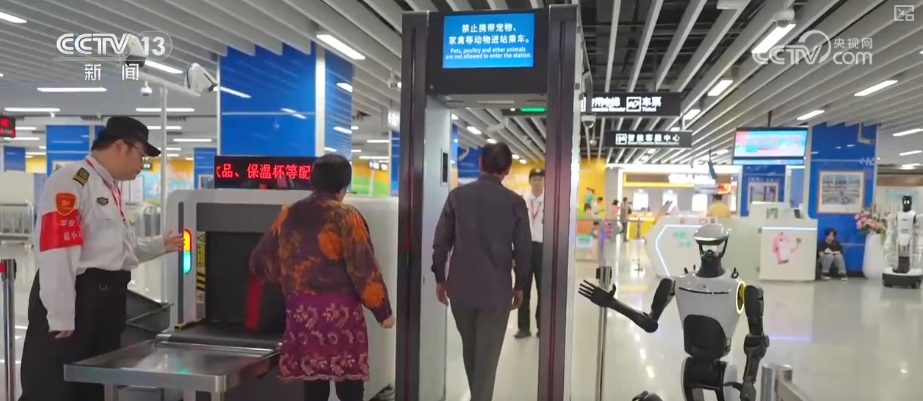 在广州黄村地铁站,一位由广汽集团研发的“新同事”正自如地为旅客提供指引与安检服务。