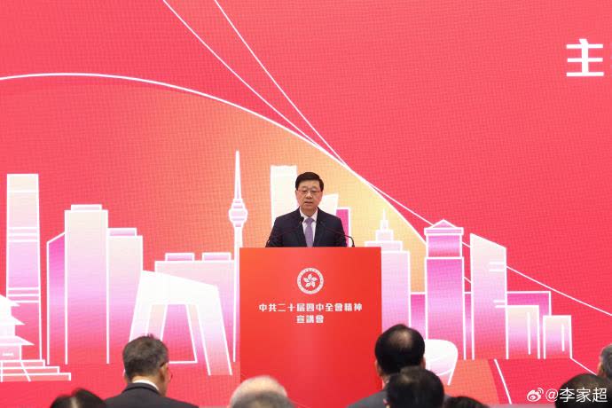 行政長官李家超今日在社交平台發文表示,衷心感謝中央對香港特區的高度重視和大力支持,應特區政府請求,經中央批准,中央港澳工作辦公室、國務院港澳事務辦公室邀請中央宣講團成員、中國科學院院長、黨組書記侯建國先生,和中央宣講團成員、中央財經委員會辦公室副主任、中央農村工作領導小組辦公室副主任祝衛東先生來港,向社會各界宣講二十屆四中全會精神,讓我們對二十屆四中全會精神和其豐富內涵有更全面和更深刻的認識和理解。