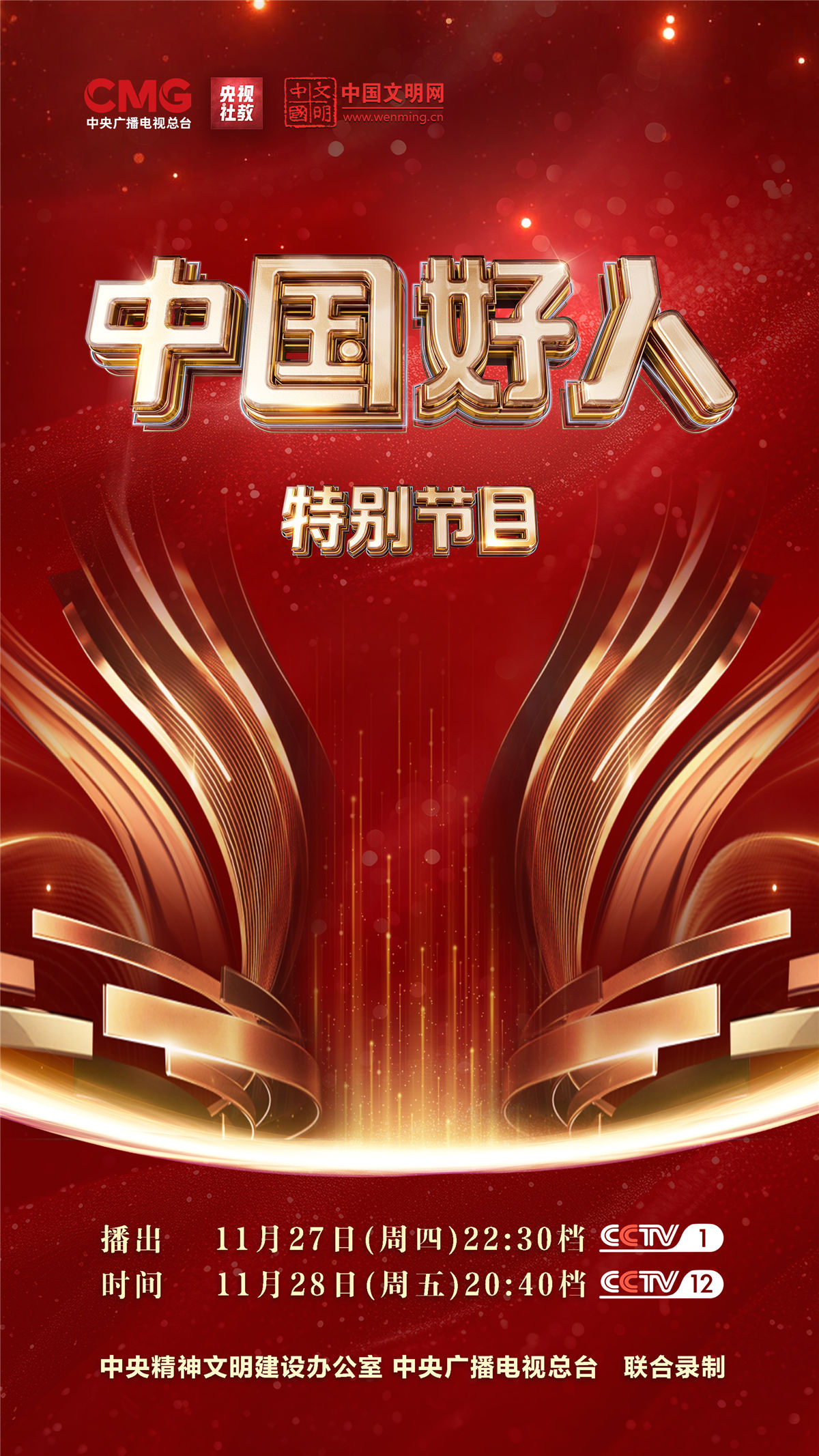 2025年11月27日22:30档,中央广播电视总台综合频道(CCTV-1),2025年11月28日20:40档,中央广播电视总台社会与法频道(CCTV-12),让我们相约“中国好人”特别节目,共赴一场真善美之约!