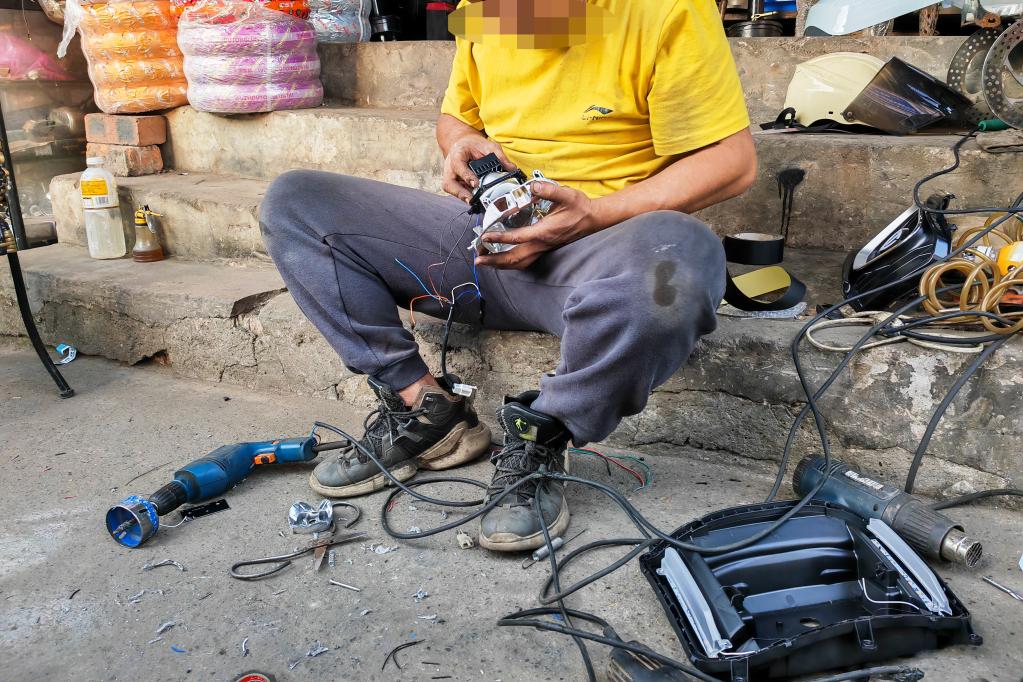 11月27日,在广西南宁市一处电动自行车零配件市场内,工作人员对电动自行车车灯进行改装。