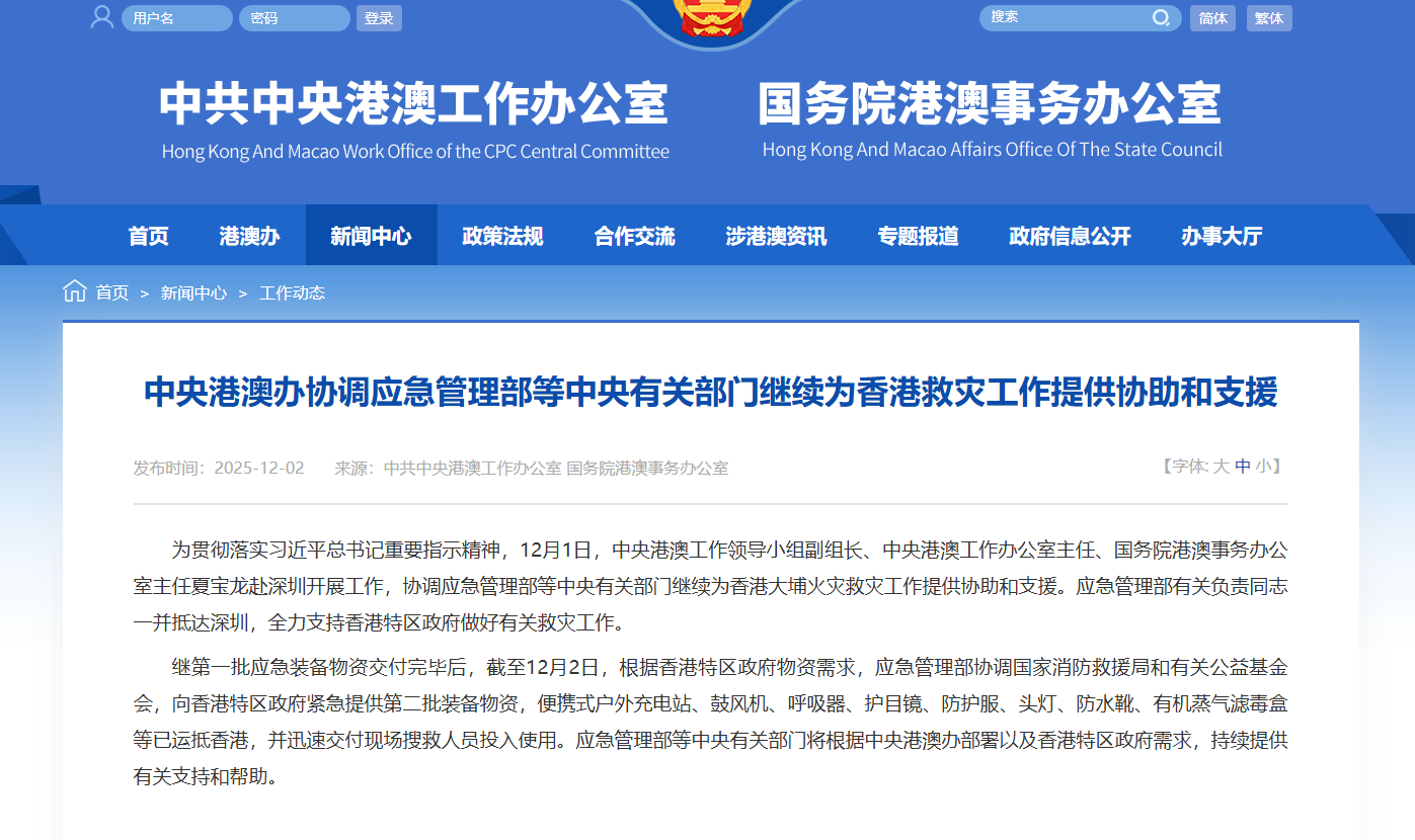 央视网消息:为贯彻落实习近平总书记重要指示精神,12月1日,中央港澳工作领导小组副组长、中央港澳工作办公室主任、国务院港澳事务办公室主任夏宝龙赴深圳开展工作,协调应急管理部等中央有关部门继续为香港大埔火灾救灾工作提供协助和支援。应急管理部有关负责同志一并抵达深圳,全力支持香港特区政府做好有关救灾工作。
