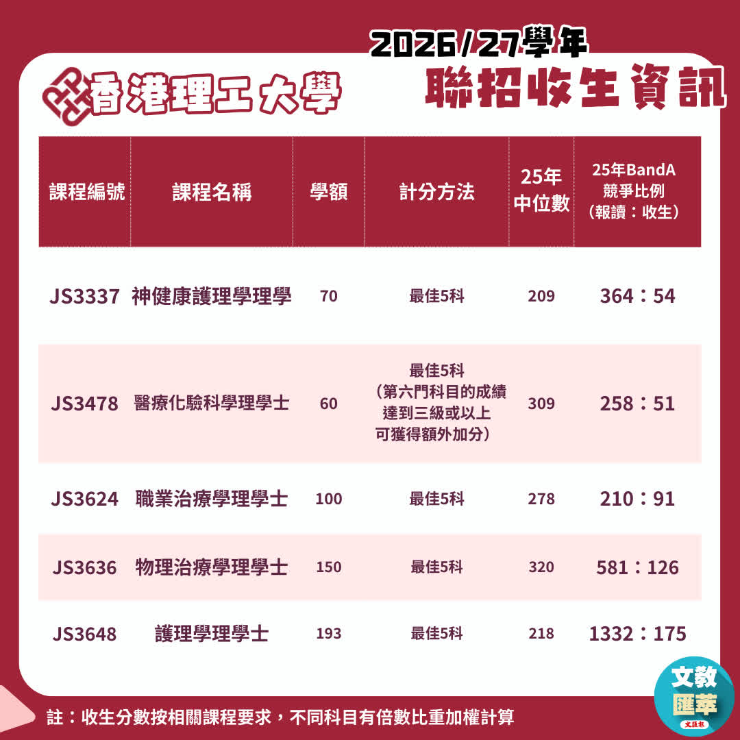 2026年入學的大學聯招(JUPAS)首輪申請將於明天(12月3日)下午5時截止。香港文匯報記者整理多所資助大學的各項醫學治療與護理課程的資料,涵蓋收生名額、往屆收生競爭與分數等重要資訊,供正在規劃前路的中六文憑試學生,以及感興趣青少年參考,幫助他們認準自身目標與相關升學要求,讓關愛的心與專業知識和培訓結合,他日成為支撐社會的重要棟樑。