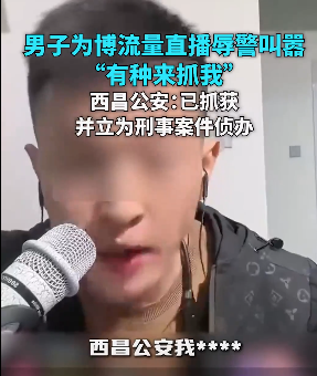 ·男子为博流量直播辱警叫嚣“有种来抓我”,西昌公安:已抓获并立为刑案侦办。