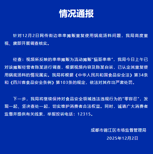 ·成都一串串摊贩回收顾客吃剩锅底,锦江区市场监督管理局通报:情况属实,严肃处罚。