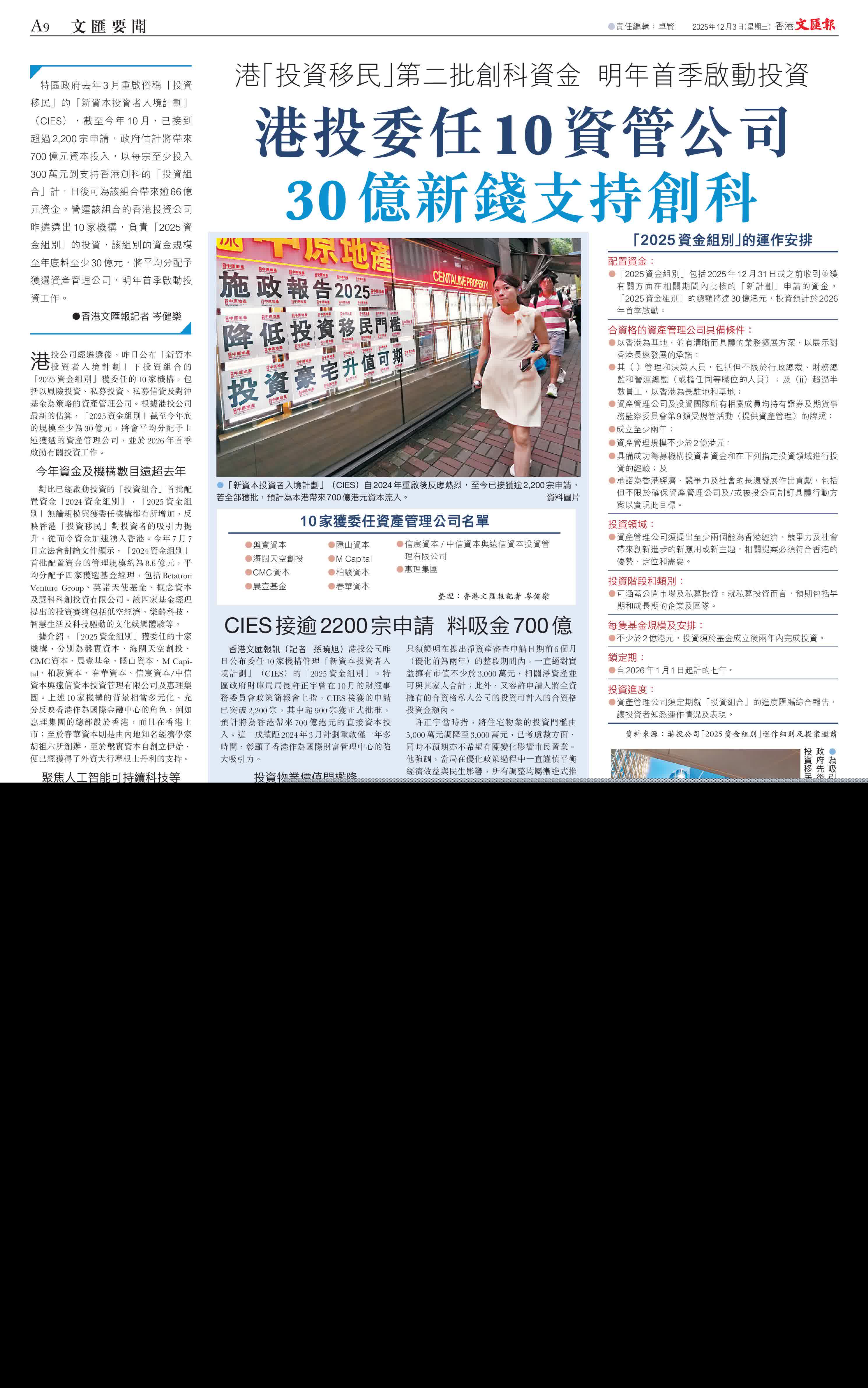 (香港文匯報記者 岑健樂)特區政府去年3月重啟俗稱「投資移民」的「新資本投資者入境計劃」(CIES),截至今年10月,已接到超過2,200宗申請,政府估計將帶來700億元資本投入,以每宗至少投入300萬元到支持香港創科的「投資組合」計,日後可為該組合帶來逾66億元資金。營運該組合的香港投資公司昨遴選出10家機構,負責「2025資金組別」的投資,該組別的資金規模至年底料至少30億元,將平均分配予獲選資產管理公司,明年首季啟動投資工作。