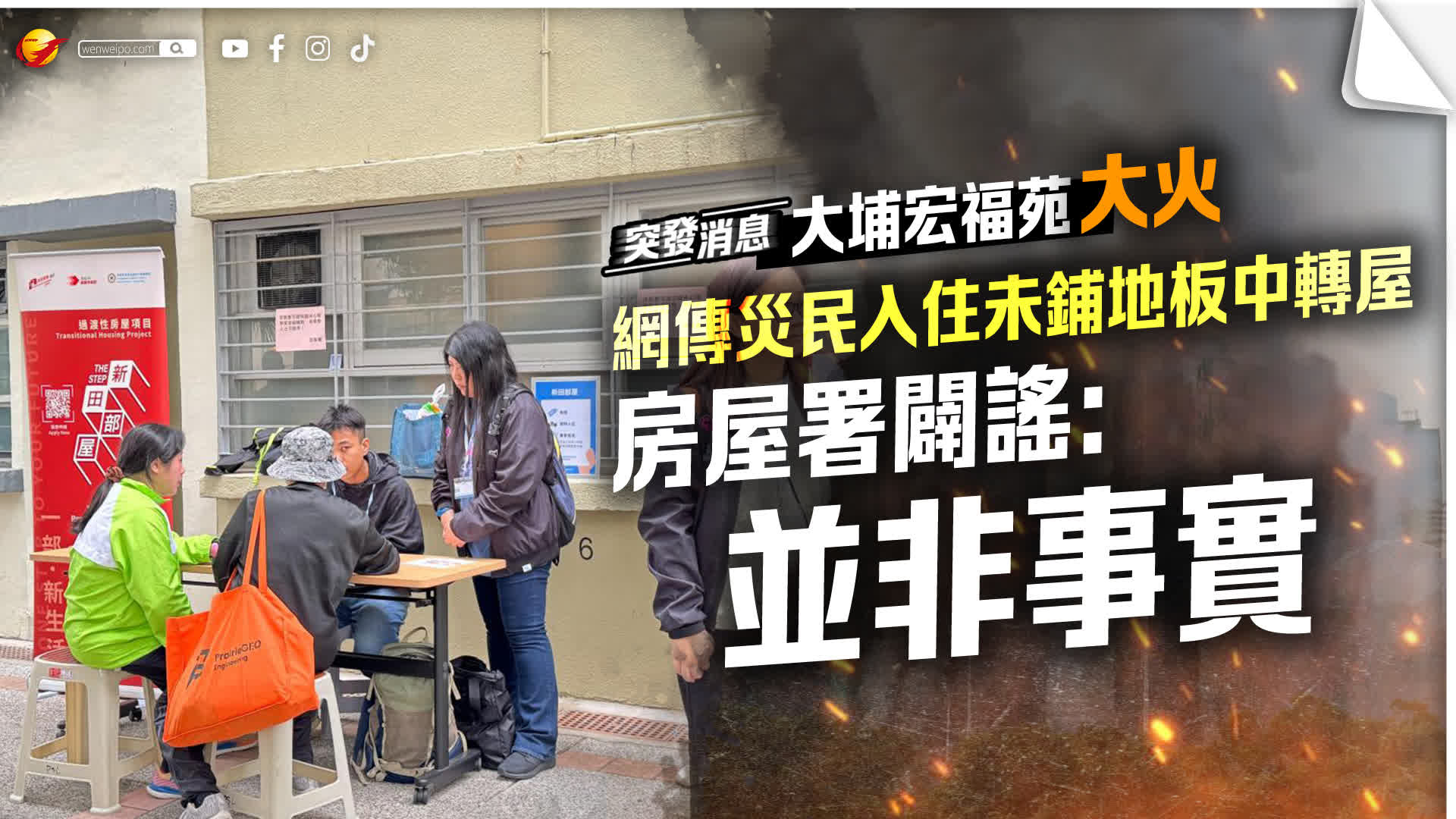 因應社交媒體上有網民聲稱受宏福苑大火影響的災民獲安排入住未有鋪妥地板的中轉屋單位,房屋署發言人澄清,有關言論並非事實,相關的中轉屋單位暫未有災民入住。