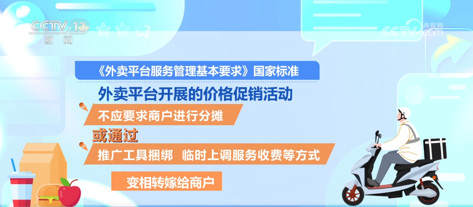 对于许多中小餐饮商户反映的平台促销活动“不参加就没流量,参加了就亏本”等问题,《外卖平台服务管理基本要求》国家标准,聚焦平台收费与促销行为,明确平台收费规则及促销活动管理要求,督促引导外卖平台简化收费项目、规范促销行为,营造公平有序的市场竞争环境。