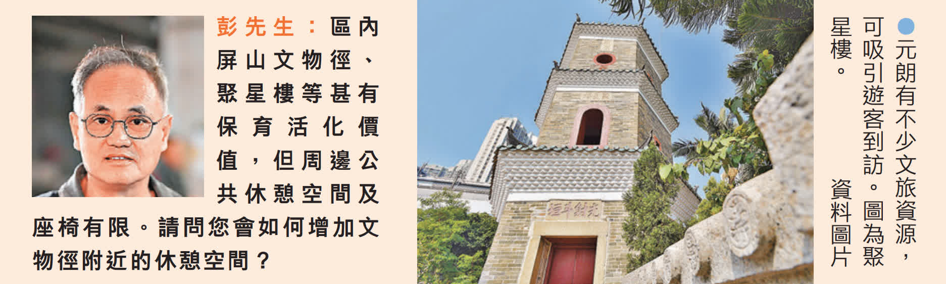 廖子聰:的確,屏山文物徑途經多個村落、圍村及宗廟;而聚星樓則為法定古蹟,亦是香港現存唯一的古塔,值得加以利用和推廣,讓遊人了解更多早期香港鄉村的生活文化。因此我認為應以與環境融合的設計為原則,加強屏山文物徑和聚星樓周邊的配套,例如加設更多座椅、休憩用的涼亭、公廁等,既不破壞環境氛圍,也提升遊人的便利度和舒適度。