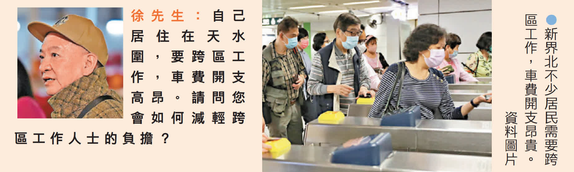 姚銘:不論是新界東北還是西北,其實要坐車到九龍、港島上班,來回交通費都不便宜,最好方法還是增加原區就業機會,才是最根本、最好的方法。要減輕跨區工作人士的負擔,希望將來能夠在可行資源下,爭取政府為公共交通津貼加碼。這個建議不容易爭取,因為現時特區政府資源也緊張,但為了新界北居民,應該要嘗試爭取。