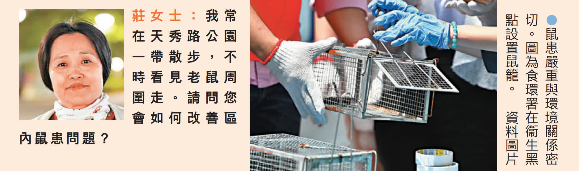 譚鎮國:非常理解大家對鼠患問題的憂慮,食環署天幕街市毗鄰天秀路公園,加上天秀路游泳池及遊樂場等新設施陸續啟用,人流增加,環境衞生管理更顯重要。我們已積極跟進此事,並與食環署及相關部門保持緊密聯繫,要求加強該區的清潔和防鼠工作,例如增加垃圾收集頻次、在鼠患黑點放置防鼠裝置,以及加強巡查食肆的後巷衞生情況。