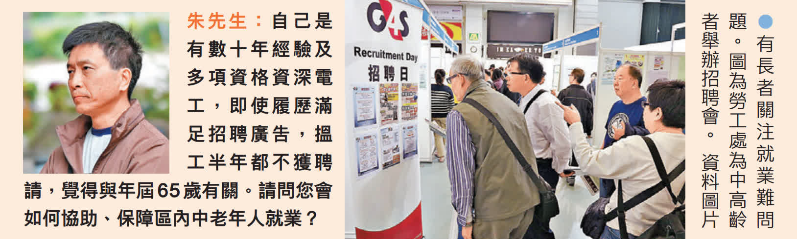 甘文鋒:建議勞工處提供更多元化的就業服務,促進中高齡人士就業,例如針對有關年齡層的招聘會,讓求職人士及僱主在招聘會上即場申請職位及進行面試,加快求職過程、提供就業轉介服務,協助配對合適人選、舉辦更多職前培訓,幫助求職人士掌握更多新技能、加強宣傳「年長求職人士專頁」及「兼職職位專頁」,方便中高齡求職人士獲取最新就業資訊和尋找合適空缺等。另外,建議將「再就業津貼試行計劃」恒常化,進一步促進中高齡人士就業。