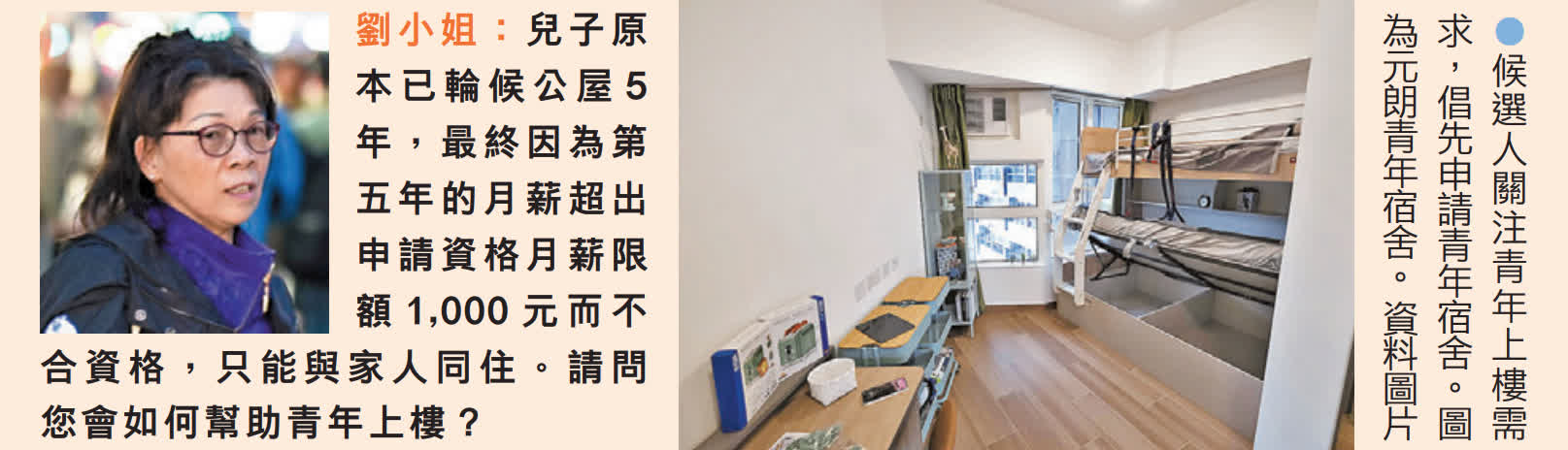 甘文鋒:青年希望離家過獨立生活,計劃未來,奈何私樓難以負擔,輪候公屋無可厚非。除了發展青年宿舍,建議當局研究為青年提供更多置業選項,讓他們按自己能力選擇合適的房屋階梯上流,例如加快調整公屋和資助出售單位的比例至六四比,並按需求檢討、調整購置居屋綠 / 白表資格,支持政府近年的「家有初生優先配屋計劃」,希望為年輕家庭提供安身立命之所。