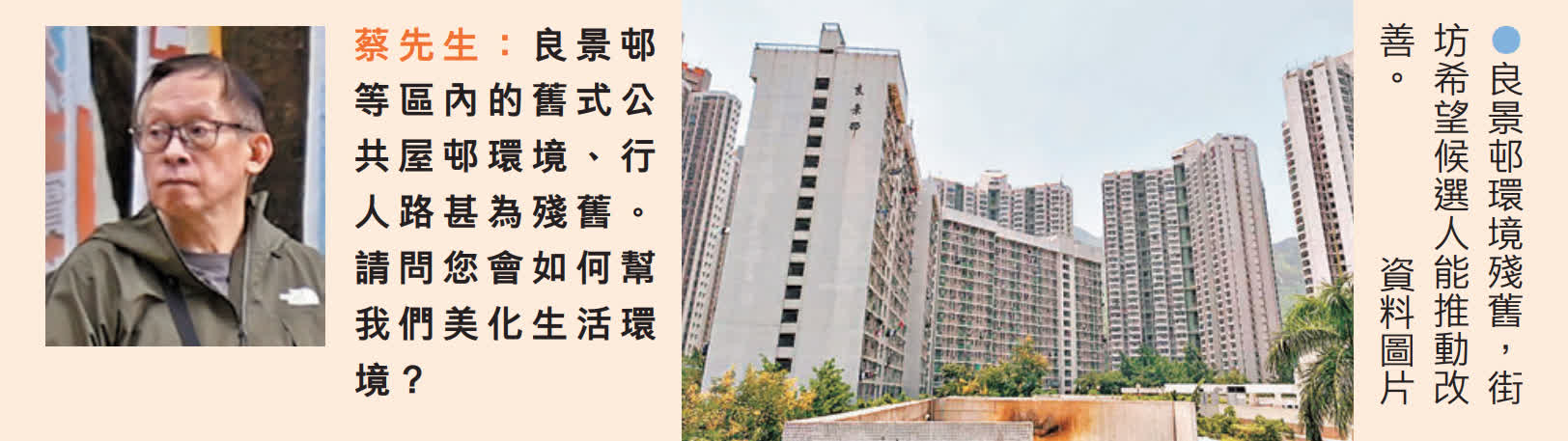 甘文鋒:良景邨是區內的租置邨,業權分散導致權責不清,而且許多業主為長者,往往面對健康和經濟上的挑戰,亦缺乏處理屋苑管理、維修事宜的經驗。隨着樓齡提高,屋邨環境老舊,設施欠維修等問題嚴重。建議在超過一定金額的大型維修項目中,由房委會介入協助招標與項目審批,以確保維修項目的質量和效率。我認為也可以考慮研究由業主手上回購部分租置屋邨公共空間的業權份數的可行性,並增加符合現時居民需求的設施,提升邨內的生活質素。