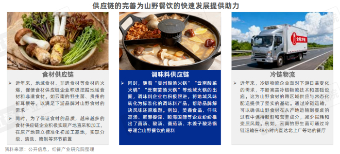 此外,供应链的完善也进一步推动了山野餐饮的快速发展。过去,山野食材因季节性强、分布零散、储运难度大而难以形成规模化的供应。近年来,越来越多的食材供应链企业积极挖掘地域食材和非遗食材,并为了保证食材的品质,积极开发产地直采和加工模式。例如,美鑫食品等企业纷纷推出了菌汤、酸汤、番茄汤、木姜子酸汤锅等适合山野餐饮的火锅底料。