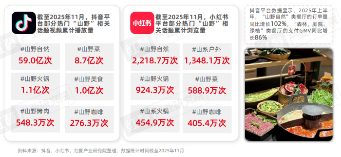 自2023年以来,“山野”相关话题在抖音与小红书等主流社交平台持续升温,展现出强劲的传播势能与内容扩散力。具体来看,截至2025年11月,抖音平台上,“山野自然”“山野菜”“山野火锅”等话题的视频累计播放量已超亿次级别,还有“山野烤肉”“山野咖啡”等多个热门话题亦有百万次播放量;小红书平台上,“山野自然”“山系户外”等相关话题的累计浏览量均达到了千万级别,“山野火锅”“山野咖啡”等垂类话题的累计浏览量亦超过了百万次。