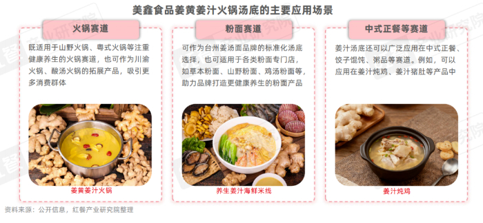 红餐产业研究院进一步了解到,姜汤火锅汤底具有独特的风味和养生功效,适合应用在多种餐饮场景中,如姜汤面、姜汤米线、姜汤鸡煲、姜汤调蛋等。以美鑫食品推出的姜黄姜汁火锅汤底为例,它不仅可以应用到火锅赛道,还可以灵活应用到粉面、饺子馄饨、中式正餐等赛道。