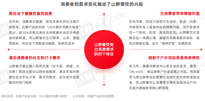 山野餐饮的兴起主要源于其满足了消费者多方面的消费需求。一方面,近年来,消费者对健康、原生态食材的关注度不断提高;另一方面,快节奏生活促使消费者对“疗愈场景”的需求不断,而山野餐饮通过山野食材、自然元素等打造的沉浸式场景,能够为消费者提供轻松、愉悦的情绪价值,也能满足年轻消费者在社交平台分享、展示的需求。此外,相较于露营、旅行等高成本活动,山野餐饮对时间和场地的要求不高,为追求山野自然的消费者提供了更易得的选择。
