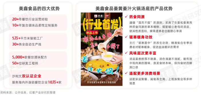 洞察到以上痛点,一些专业的供应链企业对姜汁汤底进行了研发。以美鑫食品为例,其洞察到了火锅市场的这一趋势,并率先展开了姜汁火锅汤底的标准化研发,于2025年11月推出了姜黄姜汁火锅汤底。