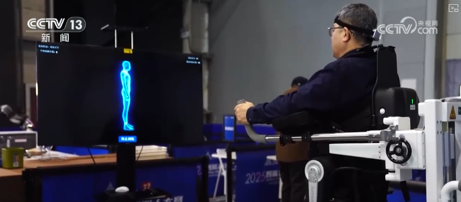 参赛队伍研发人员王俊鹏介绍,它的秘诀在于集成了脑机接口模块,系统通过读取使用者的脑电信号,解析其运动意图。这比传统被动拖拽训练方式,更能促进神经功能重塑,提升康复效果。